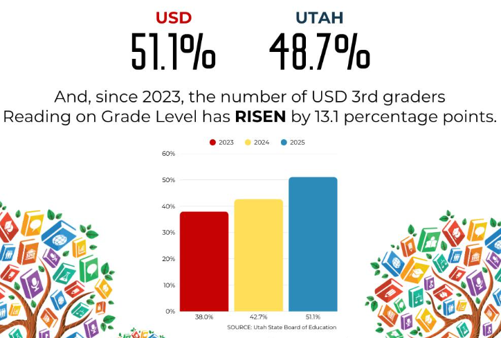 The numbers are in and the Uintah School District is celebrating. The District announced on Tuesday that at the end of the 2024-2025 school year, Uintah School District third graders exceeded the state average for Reading on Grade Level with a state average of 48.7% and the district average reaching 51.1%. Why is this such a big deal? “The research is clear,” shares Superintendent Dr. Rick Woodford. “Students who read at grade level by the end of 3rd grade are much more likely to graduate from high school and enjoy life-long economic, health, and social benefits.” District Elementary Curriculum Director Jayme Leyba explains that over the past three years, third-grade reading scores in the District have increased by 13.1 percentage points. “While many factors may have contributed to this growth,” says Leyba, “three stand out: the intentional implementation of evidence-based programs such as CKLA and UFLI, consistent monitoring and support from administrators to ensure program fidelity, and teachers’ effective analysis of student reading data to guide instruction.”