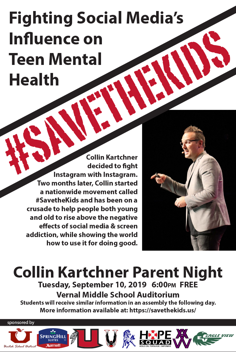 It’s hard if not impossible to know all the long term effects that social media is having on lives, especially on young lives that equate what they see on screens as reality. Recognizing the need, the Uintah School District is doing their part to fight social media’s influence on teen mental health by hosting a free informational night for parents at the Vernal Middle School Auditorium on September 10th at 6pm. The informational meeting will feature speaker Collin Kartchner, the founder of the nationwide #SaveTheKids movement. Kartchner is crusading “to help people both young and old to rise above the negative effects of social media and screen addiction, while showing the world how to use it for doing good.” An assembly will be held the following day for secondary students. For more information, visit https://savethekids.us/.