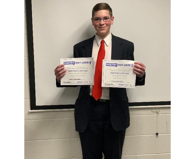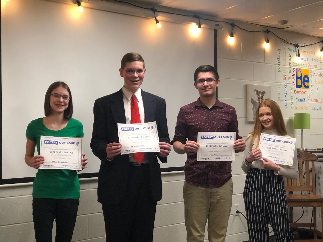 It takes a lot of courage to get up and perform in front of judges but that’s exactly what a talented group of high schoolers did on Tuesday night at the Eastern Utah Regional ‘Poetry Out Loud’ competition held at Uintah High School. ‘Poetry Out Loud’ is a national poetry recitation contest where classroom and school winners can win cash prizes and advance to regional, state, and national competition. ”Students from Uintah and Terra Academy recited two poems from Poetry Out Loud’s catalog of approved poems. Caylie Freidli and Devon Morin represented Terra Academy and Ellaina Merryweather and Adam Semadeni represented Uintah,” shares event organizer and Uintah High School English teacher Kristen Baumgarten. “The students were critiqued on their physical presence, their dramatic appropriateness, their evidence of understanding, and accuracy of the recitation.” Uintah’s Adam Semadeni was awarded 1st place and Terra’s Caylie Freidli was the runner up. Adam received a $150 award and will compete at the state level in Salt Lake City on March 11th. Adam described Tuesday’s competition as both enjoyable and enlightening, emphasizing that he was shocked to be named the winner. His decision to compete came from a place of self improvement. “I chose to compete so I could get over my fear of performing in front of judges,” shares Adam. “I decided to do this hard thing because I try to do the best that I can in every subject. To not compete would be to surrender to my fear and self doubt.” Congratulations Adam Semadeni and thank you for your courageous example!