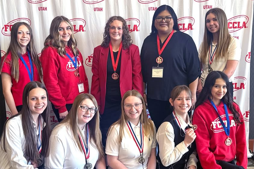 Ten Uintah High students competed at the FCCLA State Leadership Conference in Layton last month and several have qualified for National competition this summer. FCCLA stands for Family, Career and Community Leaders of America and is a national organization for students participating in Family and Consumer Science educational classes. Three Uintah students earned gold medals at the state competition and seven earned silver medals. Addilyn Foley and Ashley Caldwell qualified to compete at the National Convention in Orlando, Florida, in July while Ruby Glazier is an alternate for Nationals. Addilyn Foley earned a silver medal in Early Childhood Education while Ashley Caldwell earned a gold medal in Fashion Construction.