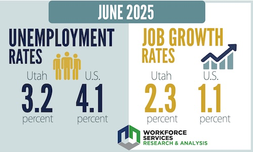 Utah’s latest data on unemployment has been released. According to the Department of Workforce Services, June’s seasonally adjusted unemployment rate is estimated at 3.2% with approximately 59,461 Utahns unemployed. The June national unemployment rate is down a tenth of a percentage point at 4.1%. Locally, Daggett County’s unemployment has remained at 3.9% and Uintah County has remained at 3.3% while Duchesne County ticked up from 3.4% to 3.5%. The data also reported that 8 of the 10 major private-sector industry groups posted net year-over-year job gains. The overall gains are led by education and health services with 15,800 jobs, construction with 6,200 jobs, and professional and business services with 4,700 jobs. Trade, transportation, and utilities experienced the greatest year-over-year job losses.