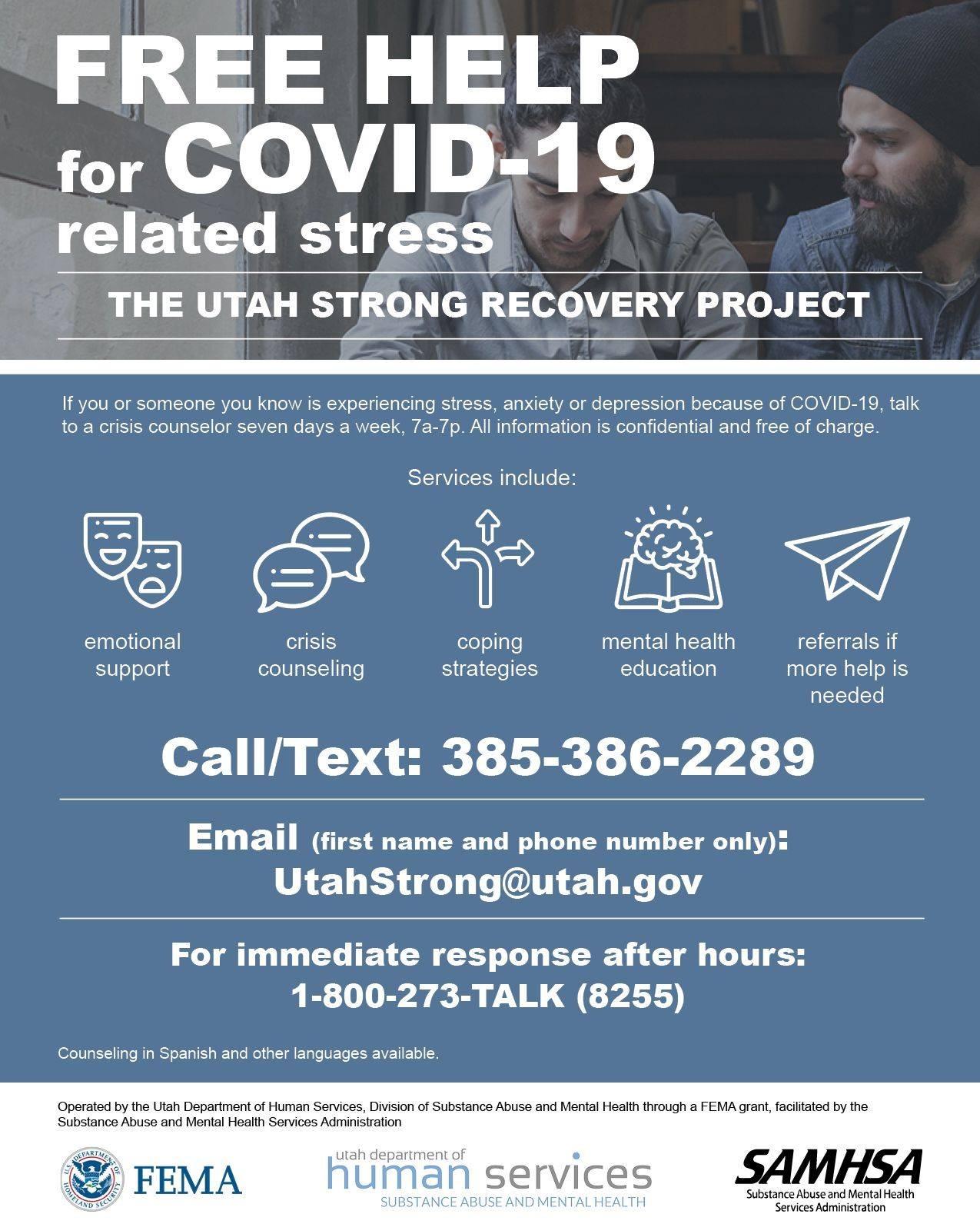 Regardless of your perspective on the COVID-19 pandemic it’s likely in one way or another it has added stress to your life. The Utah Strong Recovery Project is offering free help for COVID-19 related stress. The Uintah Basin has experienced a steady increase in local cases of COVID-19 this month. As of the Tuesday Situational Update on www.tricountyhealth.com, there are now 68 Active Cases of COVID-19 in the TriCounty Health District bumping the Overall Total to date to 114. For some of our community members, the rise in cases is incredibly stressful as they worry about their own health or the health of loved ones. It is also stressful for families hoping for the schools to open next month or for business owners affected daily by the pandemic’s economic effects. Regardless of who you are, the Utah Strong Recovery Project is offering emotional support, crisis counseling, coping strategies, mental health education, and referrals for those in need of additional help. If you or someone you know is experiencing stress, anxiety, or depression because of COVID-19, crisis counselors are available daily from 7am to 7pm by call or text at 385-386-2289. All information is confidential and free of charge. You can email your first name and phone number to UtahStrong@utah.gov or for immediate response after hours, call 1-800-273-TALK(8255).