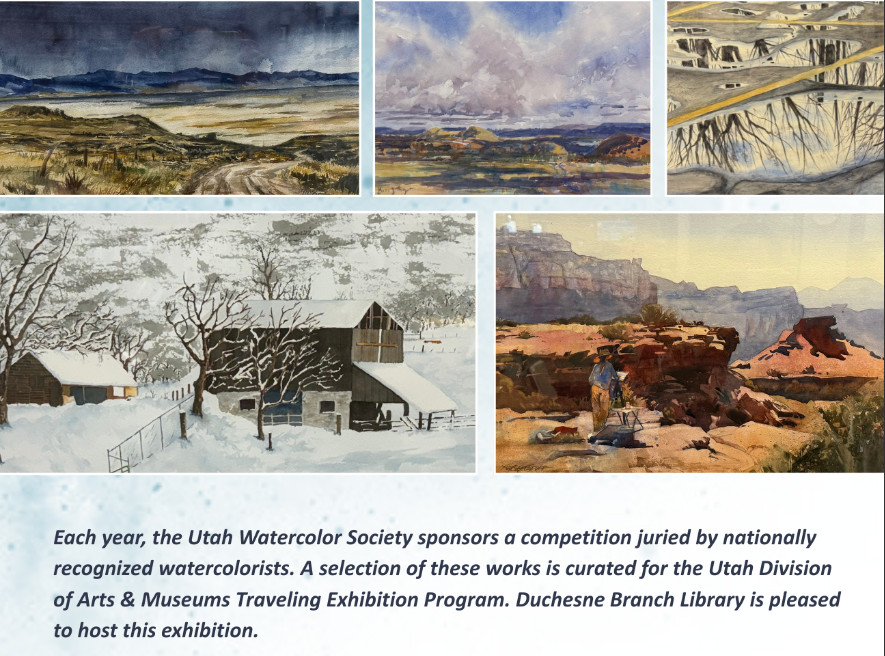A traveling exhibit has made a stop locally. The ‘Utah Watercolor Society Annual Exhibition’ will be on display through February 10th at the Duchesne Branch Library. “The pieces in this exhibition illustrate the best of Utah watercolor art, as recognized by annual exhibitions held by the Utah Watercolor Society,” shares the announcement. “The show highlights the variety of ways that watercolors can be employed in painting.” Every year, the Utah Watercolor Society sponsors a competition juried by nationally recognized watercolorists and a selection of works is then curated for the Utah Division of Arts & Museums Traveling Exhibition Program. To view the exhibit, visit the Duchesne Branch Library Monday through Thursday from 10am to 6pm or Friday and Saturday from 10am to 5pm. For additional information, visit artsandmuseums.utah.gov.