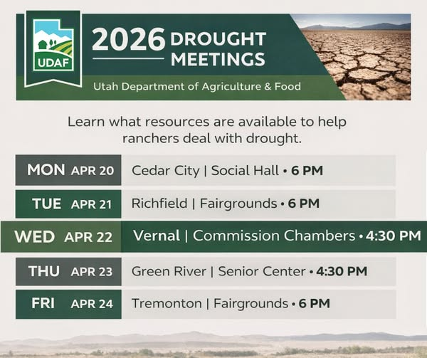 Vernal is an important stop on a state tour aimed at helping ranchers and farmers during the drought. The Utah Department of Agriculture & Food will host their first ‘Drought Meeting’ on Monday in Cedar City, then they’ll stop on Tuesday in Richfield before traveling to Vernal on Wednesday. “Federal and state land agencies will present resources available to help you deal with drought conditions,” shares the announcement. “USU Extension specialists will also be on hand to cover rangeland and pasture health, livestock health, and farm economics.” The Utah Department of Agriculture and Food invites all to come learn what resources are available to help farmers and ranchers deal with drought. The April 22 Drought Meeting is happening in the Uintah County Commission Chambers at 4:30pm. The final two drought meetings in the state are taking place on Thursday in Green River and Friday in Tremonton.