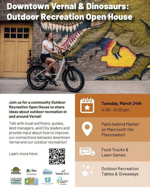 A free community event is being held tonight as part of a unique project aimed at promoting recreation connections in Vernal City. “Vernal is one of three pilot Main Street communities for this Recreation Atlas Project, working alongside Cedar City and Parowan,” shares the project website. “The Utah Main Streets Program received a Utah Division of Outdoor Recreation grant to develop this project, and has contracted with a community and recreation planning firm, SE Group, to work with these three pilot communities…The outcome of this project will be a mapped atlas of Vernal’s outdoor recreation assets, along with tangible recommendations to strengthen connectivity between these outdoor destinations and Vernal’s Main Street.” Tonight there will be a fun opportunity to learn more and share your ideas about outdoor recreation in and around Vernal. The Outdoor Recreation Open House is happening on the patio with the Pteranodon behind Market On Main on the Cobble Rock Block from 4 to 6pm. There will be food trucks, lawn games, community input stations, and participant giveaways. The initial research and community engagement phase of the project is expected to last until May.