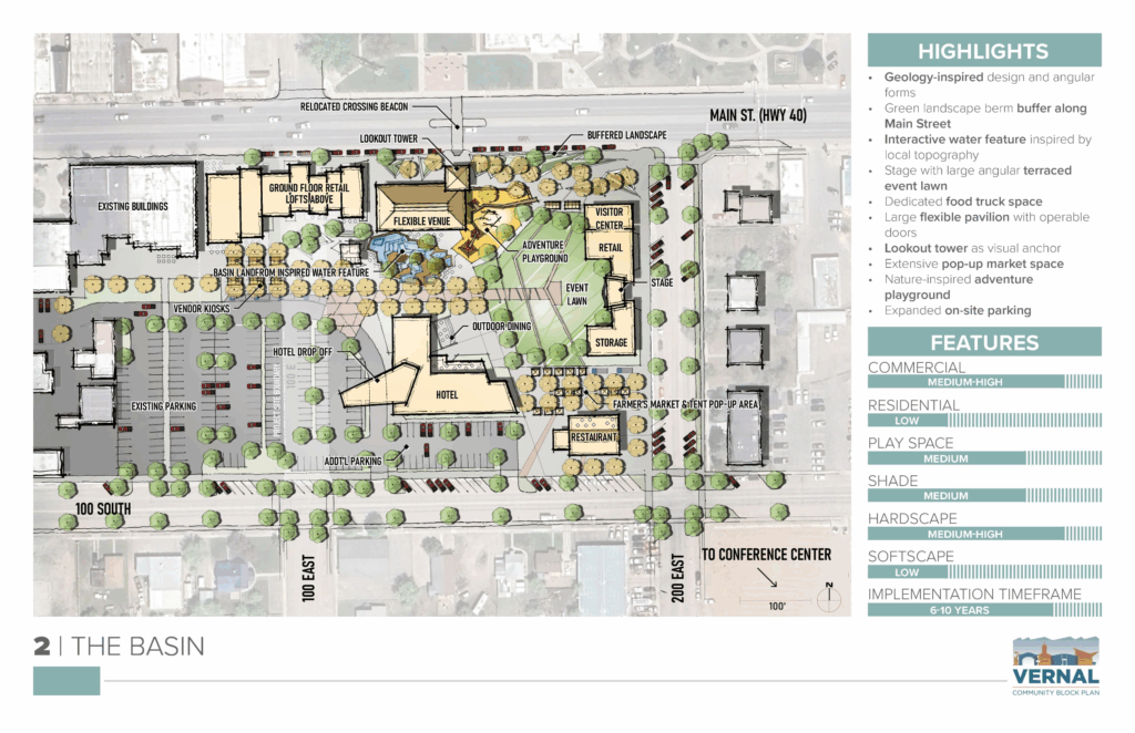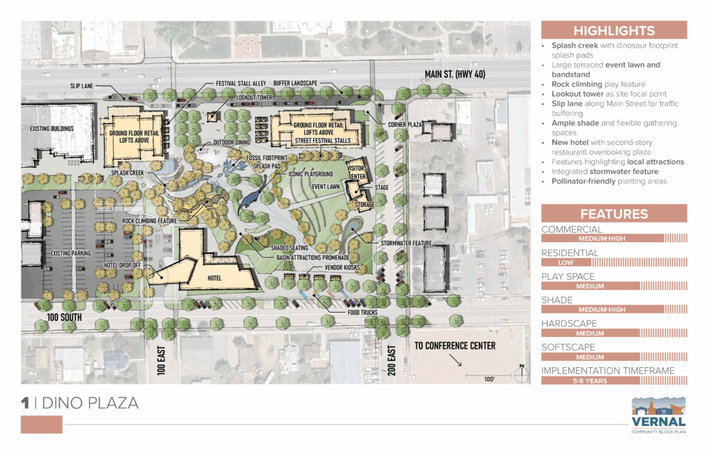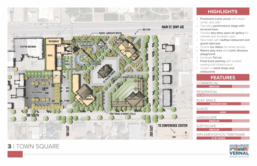 Vernal City has shared the concept designs for the recently acquired Lamplighter Block that is scheduled for demolition in the coming months. The designs are shared through a survey that allows for feedback on 3 concepts and style preferences. The first stage of community engagement took place earlier this year when 752 online survey responses were received and over 50 people chose to attend an open house about the project. The feedback gathered guided the development of the 3 concept designs now shared. The first concept is called the Dino Plaza that weaves a splash creek and dinosaur playground with shaded paths through the plaza that includes a hotel, restaurant, retail space with lofts, and an event lawn with a bandstand. The second concept is called The Basin and is inspired by the region’s geology by including designs to reflect the local landscapes. It also includes a water feature, hotel and restaurant, event lawn with a bandstand, and retail space with lofts as well as a landmark tower and different block layout. The third concept is called the Town Square and includes a different layout of the features but builds in more activities in every season, including a space for an ice ribbon and pavilion. The survey is easy to follow, allowing the viewer to rank the concepts and share specific features and design options that are preferred. A link to the survey is available through Vernal City or with this news story on BasinNow.com.