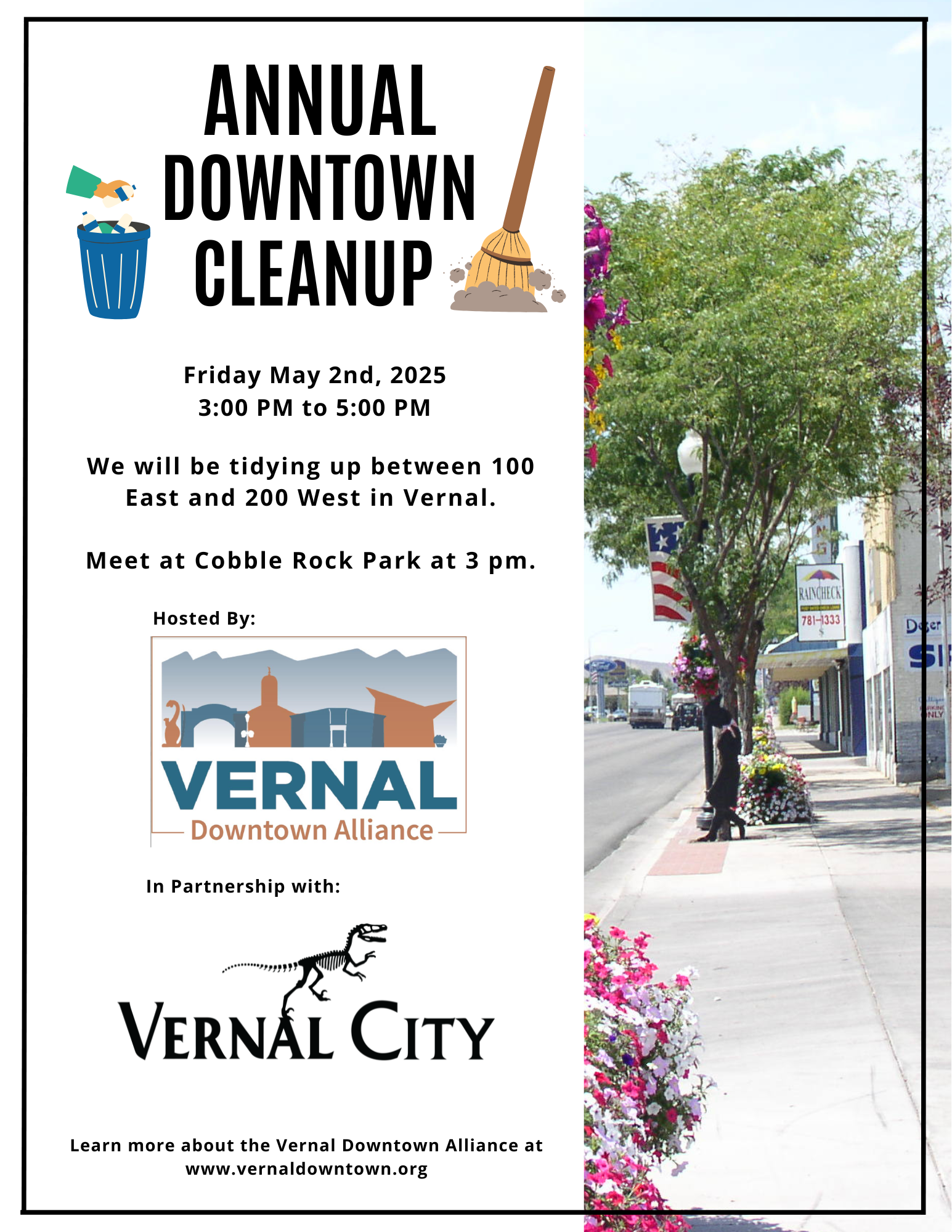Summer is not far off and Vernal City downtown will be busy with visitors. To prepare, the Vernal Downtown Alliance has partnered with Vernal City to host a downtown cleanup and all are invited to help. Vernal City is providing everything needed for the cleanup between 100 East to 200 West, including gloves and garbage bags. Rebecca with the Vernal Downtown Alliance has issued the invitation for all to bring their family and help out. “We want to keep our downtown looking beautiful, especially with all the work going on to revitalize downtown,” shares Rebecca. “We want to keep it looking as beautiful as possible as we look to the busy tourist season with people getting outdoors.” Come to Cobblerock Park on Friday from 3 to 5pm or even for just a few minutes during that time and let’s keep Vernal beautiful!