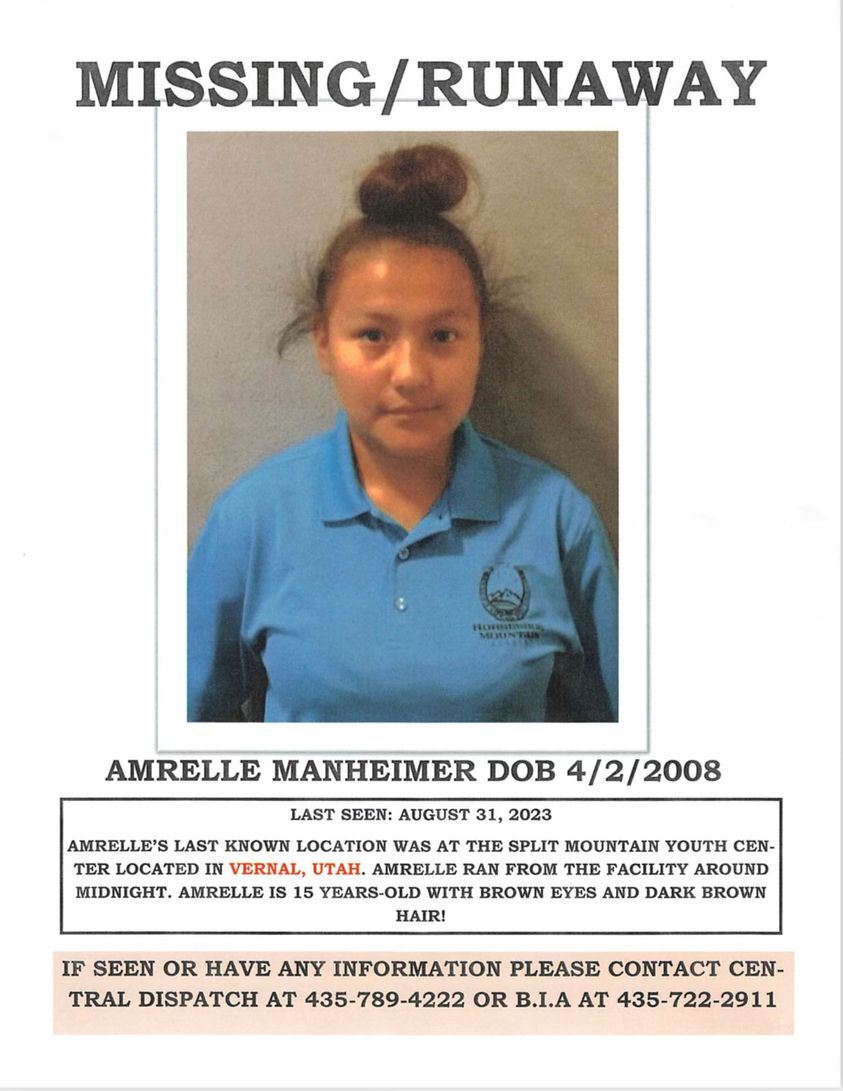The Vernal Police Department is seeking the public’s assistance in locating a missing/runaway juvenile. 15-year-old Amrelle “Neveah” Manheimer went missing on August 31st. Her last known location was at the Split Mountain Youth Center in Vernal. Amrelle ran from the facility around midnight . She has brown eyes and dark brown hair. If you have any information as to the whereabouts of Amrelle please contact the non-emergency dispatch number at 435-789-4222. An image of Amrelle has been shared on the Vernal PD Facebook page and with this story on www.BasinNow.com.