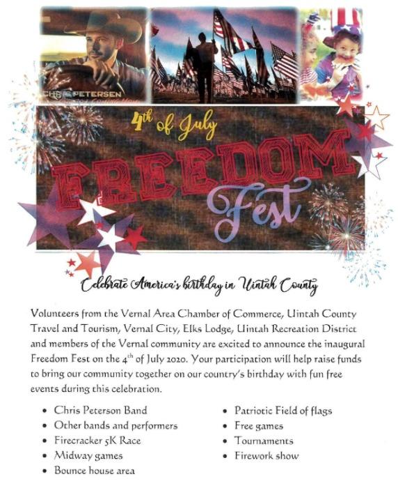 Volunteers from the community have joined forces with the Vernal Area Chamber of Commerce, Uintah County Travel and Tourism, Vernal City, Elks Lodge, and Uintah Recreation District for a new patriotic tradition. Members from these groups have formed the Freedom Fest Committee. The Committee has made plans to unite love of community and love of country by holding Uintah County’s first Freedom Fest. This event will take the traditional Fourth of July parade and fireworks in Vernal and extend the festivities to be an all day event. There will be the parade down Main Street but bigger and better than ever. “This year we’re stepping it up to make it as American as we can get because it is about time we celebrate freedom, put our foot down and say this is where we stand,” shares event organizer Bobby Oostveen. “This is a town that is strong and willing and ready to fight for what we believe in.” There will also be music and entertainment all afternoon long at the park, games, goods, food vendors, tournaments, and don’t forget about the amazing revamped edition of the Freedom Fireworks!