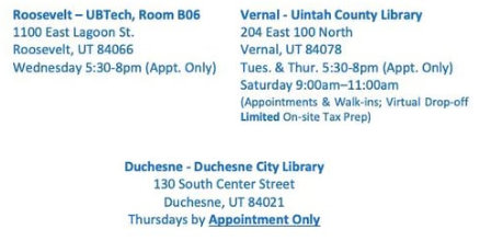 Keeping as much of your hard earned money as possible is a lot easier when you have expert help and if you’re hoping that money comes in the form of a tax return then you’re in luck! The Uintah Basin has three sites available for free tax preparation services. VITA stands for Volunteer Income Tax Assistance and it pairs up trained/IRS certified volunteers with Uintah Basin citizens needing help filing their taxes. Appointments for free tax preparation are available in Roosevelt at UBTech, Vernal at the Uintah County Library, and Duchesne at the Duchesne City Library. Availability in Roosevelt and Duchesne are by appointment only while Vernal has appointment times as well as 9 to 11am on Saturdays for walk-ins. For more information or to make an appointment, visit www.UBAOG.org.