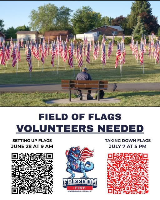 It’s time again to celebrate our freedom and a favorite part of local celebrations is in need of volunteers. The Field of Flags displays over 700 American flags in the Walking Park on 500 North in Vernal each year over the Independence Day holiday. “Your volunteer efforts in helping to raise the flags high or respectfully take them down will create this powerful, patriotic, display,” shares the announcement. “Help us to fill our community’s heart with pride and celebrate the freedoms we cherish.” To sign up to volunteer, please visit www.JustServe.org or call 435-781-7108.
