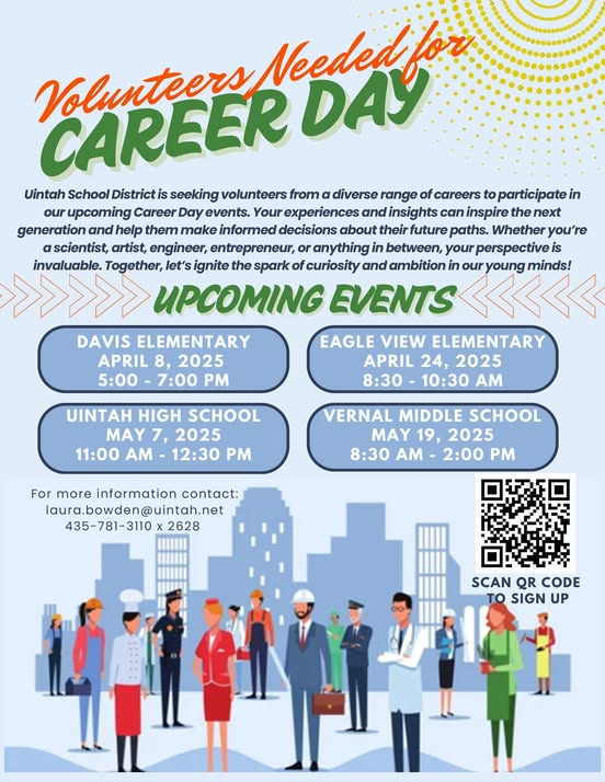 Are you a working professional willing to spend some time sharing about your chosen field with local youth? The Uintah School District is seeking volunteers from a diverse range of careers to participate in Career Day events this spring. “Your experiences and insights can inspire the next generation and help them make informed decisions about their future,” shares the announcement from Uintah School District. “Whether you’re a scientist, artist, engineer, entrepreneur, or anything in between, your perspective is invaluable. Together, let’s ignite the spark of curiosity and ambition in our young minds!” Upcoming Career Day events are being held at Davis Elementary on April 8th, Eagle View Elementary on April 24th, Uintah High School on May 7th, and Vernal Middle School on May 19th. For more information or to volunteer for one or more of these events, contact Laura Bowden at 435-781-3110, extension 2628.