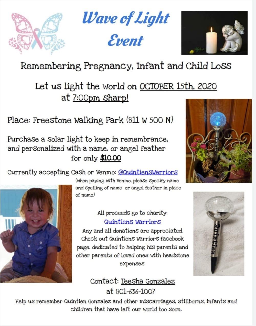 A local mother is honoring and remembering her son in a special way all while inviting other local families who have experienced the loss of a child to join her. The 1st annual Wave of Light Event is being held October 15th at 7pm at the Freestone Walking Park in Vernal. Families are invited to come to the walking park in memory of their own pregnancy, infant, and child loss. Event organizer Teesha Gonzalez lost her son Quintien to illness when he was just 15 months old in 2018. “I would love to see the walking park filled with families there with me remembering the light my son showed the world and remember their babies and the light that they had!” shares Teesha. “Help us remember Quintien Gonzalez and other miscarriages, stillborns, infants and children that have left our world too soon.” The Gonzalez family started the charity ‘Quintien’s Warriors’ to first raise money for Quintien’s headstone as well as raise money now and into the future to help other local families with the expenses of a child loss. To raise money for this effort they are selling special solar lights that can be used at the Wave of Light event and then kept as a keepsake. The lights are $10 and can be personalized with a name or angel feather. Those interested in purchasing the special solar light can contact Teesha and it is best if they are ordered by the 13th so they are ready by the event on October 15th. Later orders are also welcomed. Families are welcome to bring their own lights to shine at the event as well. For more information, visit the Quintien’s Warriors Facebook page or contact Teesha at 801-636-1007.