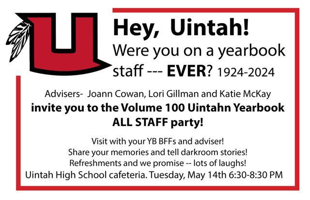 If you can believe it, there have been 100 years of documenting the achievements and activities of Uintah High School and now it’s time to party. The Uintahn yearbook “marks 2024 as a century in publication and the best book of Uintah High School produced year after year.” If you have served on a Uintah yearbook staff anytime from 1924 to 2024 then you are invited to the Volume 100 Uintahn Yearbook ALL STAFF party. Advisors Joann Cowan, Lori Gillman, and Katie McKay will all be there ready to reminisce and tell darkroom stories. Spread the word to family and friends who served on the yearbook staff so they don’t miss out on the fun. The party will be on May 14th at 6:30pm in the Uintah High School cafeteria.