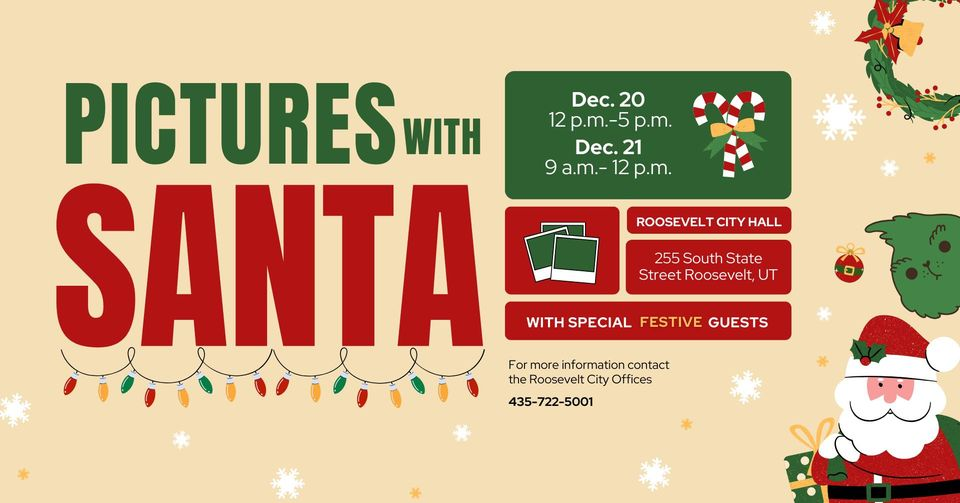 If your kids still need a chance to see Santa Clause this year you’re in luck. Roosevelt City is hosting the big man in red today and tomorrow for the community to come get pictures. There will also be other special guests. The Pictures with Santa events will be held today from noon to 5pm and tomorrow from 9am to noon at Roosevelt City Hall. For more information, call 435-722-5001. Vernal City is also inviting the community to come out for a Story Time with Santa. Santa, MagnifiClint, Cocoa the Elf and Noel the Elf will be in the Vernal City Community Room tomorrow. Bring your kids to enjoy a storytime and of course catch a picture. Story Times will take place at 2pm and 5pm.